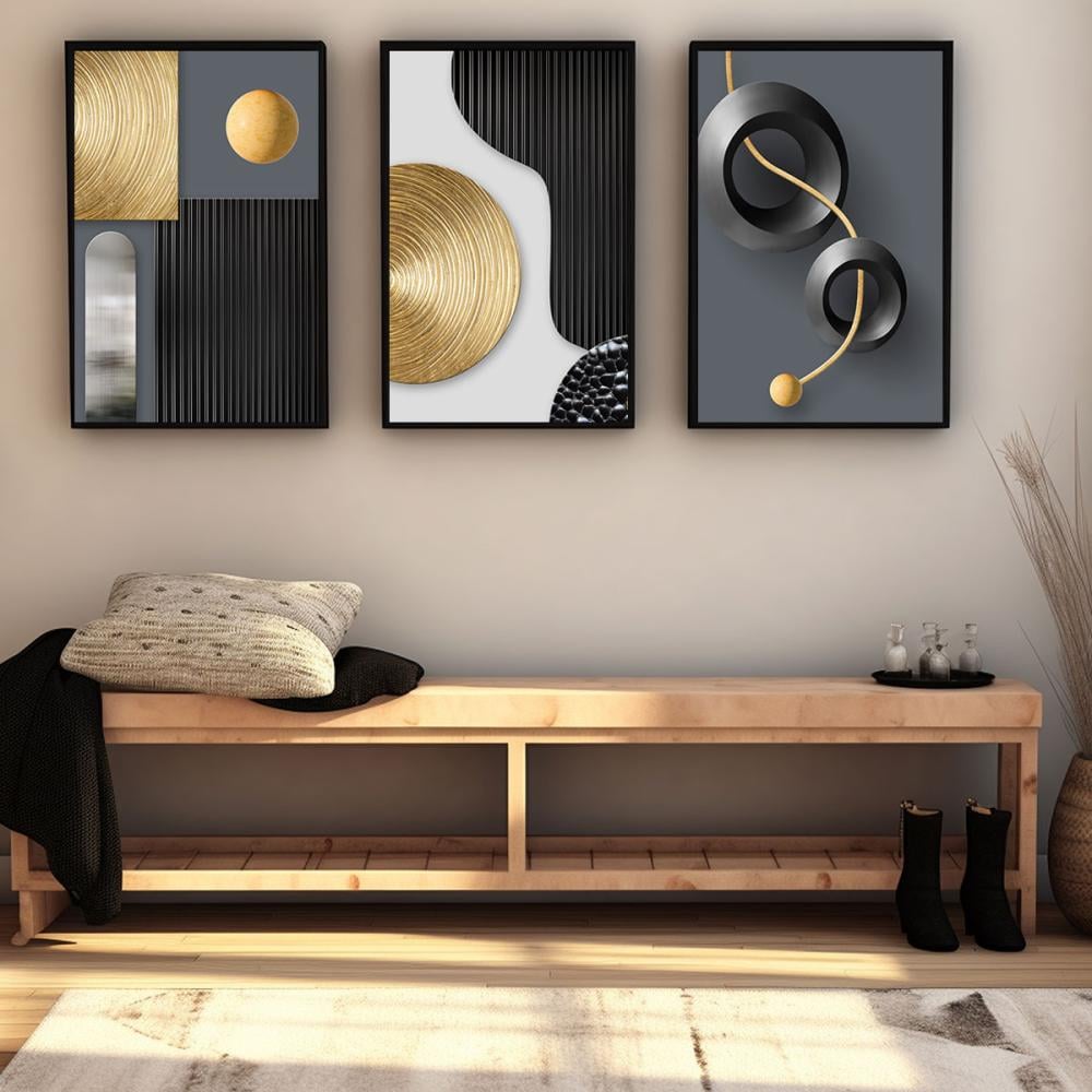 - تمتاز لوحات حائط 3 قطع بتناغم الألوان فإن الدمج بين الذهبي والأسود والرمادي يعطي مظهر مودرن أنيق يليق بمجالس الرجال، صالات البيت وحتى غرف النوم.